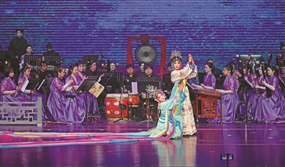 1月19日晚,“有情有义 世界义乌 薪火传承 戏韵流芳”文化特派员成果展演在义乌文化广场剧院举行。义乌市佛堂镇实验幼儿园、佛堂小学、绣湖小学、杨村小学等7所学校的49名学生应邀参演。图为义亭小学四年级学生鲍瑾萱与义乌市婺剧保护传承中心演员孙悦玮同台表演《天女散花》。