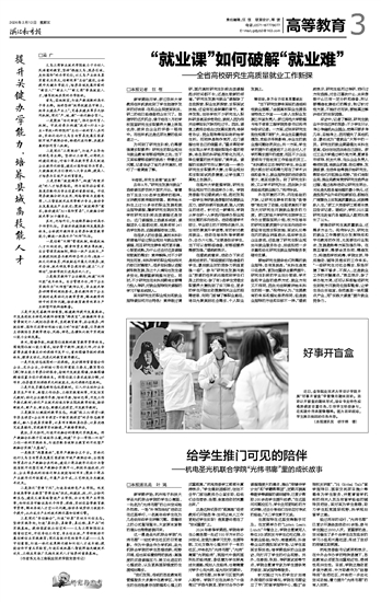 要推动研究生高质量就业,还需多方合力。祝伟华认为,研究生的就业工作需要充分发挥导师和专任教师的作用,尤其要在行业现状、发展趋势等方面加强引导。在袁旦看来,需要全员协同、精准发力,构建起学校统筹、学院主抓、导师推动、辅导员落实的工作体系。“一些研究生对社会需求、职场环境了解不够多、不深入,正是就业工作的关键痛点。”袁旦表示,除了举办地方周,还可以积极输送研究生到地方开展岗位挂职锻炼,让学生走出实验室,走进基层一线和重点产业,用“实践大课堂”提升就业竞争力。