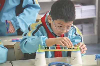 四年级学生汤昭扬从小喜欢拼搭积木,听说“桥梁小工程师”课程开课了,第一时间就报了名。这门面向三至六年级的课程,根据学生认知与技能水平设置了梯度分明的任务:中年级学生尝试用人体搭拱桥、制作吸管桥和纸雕桥,高年级学生则挑战用木块、木片搭建廊桥和承重桥。“让学生在模仿和构建中理解桥梁的工程结构。”周建芬这样概括课程设计的初衷。