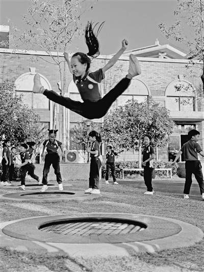 图为江山实验小学学生在课间玩蹦床。