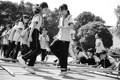 图为遂昌县石练镇中心小学学生在跳竹竿舞。