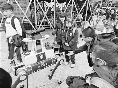 近日,杭州滨兴学校上学路上迎来一位特殊的“保安”——由杭州市滨江区公安部门为学校特别调配的机器狗。它自如穿行于人群中,实时进行安全播报。图为学生在和机器狗打招呼。(本报通讯员 郑俊杰 摄)