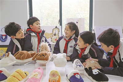 日前,慈溪市实验小学教育集团举办拖鞋设计展。现场展示的拖鞋是该校美术跨学科教学的成果,由学生亲手设计、企业落地生产。图为学生在介绍自己的拖鞋设计理念。