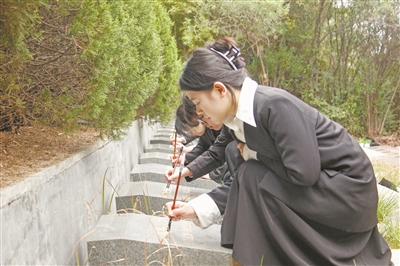 清明节前夕,金华职业技术大学商学院团委组织青年学子前往金东烈士陵园,开展“缅怀先烈志,青春五色行”主题教育实践活动。学生们通过敬献鲜花、擦拭烈士墓碑等方式,缅怀先烈。图为学生正在为烈士墓碑描金。