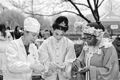 3月27日,浙江越秀外国语学院第二届“非遗进校园”活动在镜湖校区樱花大道启幕,多位非遗传承人亲临现场,带来嵊州小笼、绍兴面塑、绍兴花雕、诸暨棕编、扯白糖等20余项极具地方特色的非遗项目。图为留学生在学做面点。