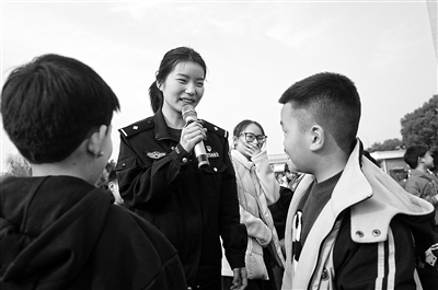 三月二十五日下午,慈溪市育才小学特邀市公安局坎墩派出所民警到校开展反诈主题宣传活动。民警结合近期高发的刷单返利、游戏币交易、冒充客服等典型案例,通过现场广播,用通俗易懂的语言为学生拆解诈骗话术。民警朱巧莹还设置了问答环节,耐心解答学生提出的问题,并邀请学生上台模拟诈骗场景。图为民警与学生亲切互动。
