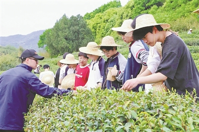 日前,绍兴市职业教育中心(绍兴技师学院)组织学生开展采茶劳动研学活动。在农业导师的悉心讲解下,学生们了解了茶叶的生长习性、种植历史和采摘技巧。图为学生们在茶树间采摘茶芽。