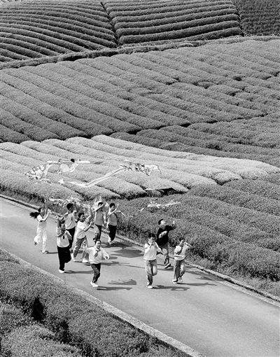 近日,武义县武川小学城东校区将春游与民俗体验相结合开展活动。图为学生们走进翠绿茶园,在放飞纸鸢中感受春日气息。