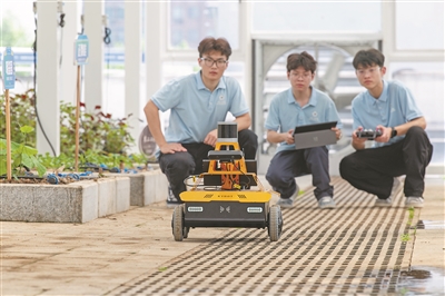 4月20日,金华职业技术大学信息工程学院智慧农业应用基地里,校企联合开发的AI农业巡检机器人正在巡检。该机器人可智能识别作物长势与病虫害情况,助力农业数字化、精细化管理。图为学生在调试机器人。