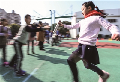 从2016学年起,华东师范大学宁波艺术实验学校每月设一个体育日,举行跳绳、广播操、运球接力、仰卧起坐等比赛,大大提高了学生参与体育运动的兴趣,增强了学生体质和班级的团队凝聚力。图为日前学生在参加绕障碍迎面接力赛。 (本报通讯员 严 龙 摄)