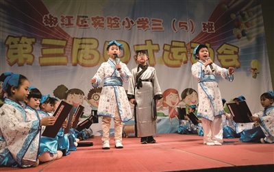 台州市椒江实验小学在拓展性课程建设中,着力打造校园特色文化,坚持每周一国旗下以班级为单位全员参与诵读,推进“全员参与,班班展示,生生锻炼”。图为日前该校三(5)班举行口才运动会。