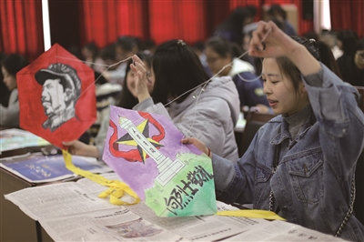 清明节前夕,浙江经贸职业技术学院通过组织祭扫烈士墓、主题团日活动、制作主题风筝等形式缅怀革命先烈,弘扬民族精神。图为该院财务会计系学生在制作主题风筝。 (本报通讯员 裘永晓 摄)