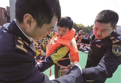 在4月15日“全民国家安全教育日”到来之前,宁波海事局海巡执法支队、鄞州区教育局在宁波市行知实验小学联合举行水上交通安全教育活动,通过现场模拟、示范来提高学生的安全防范意识特别是海上应急救护能力。图为学生在试穿救生衣。