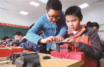 近日,嘉兴市辅成教育集团北校区清河部二至六年级的360名学生,来到该市青少年宫的实践楼上拓展课。学生们可以在这里使用专业的设施,学习陶艺、烘焙、模型制作、纸艺、机器人、木工等课程。(本报通讯员 祝慧华 摄)