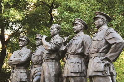 南昌起义主要领导人群塑,从左至右依次为刘伯承、叶挺、周恩来、贺龙、朱德。