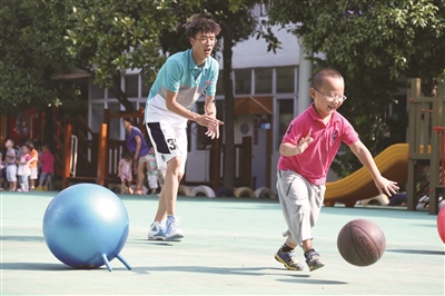 ▲从2013年开始,衢州市共招聘了154名男幼师,走在全国前列。图为男幼师带领幼儿参加户外活动。