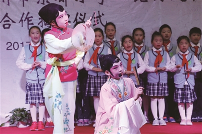 10月16日上午,浙江昆剧团“昆曲进校园”战略合作揭牌仪式在杭州市京都小学举行。早在2007年,该校就创立了“小昆班”昆曲社团。图为学生们正在演出《牡丹亭·游园——皂罗袍》。