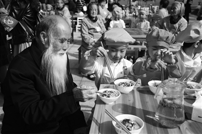 重阳节来临之际,宁海县兴华幼儿园的孩子们带着自己在幼儿园里种植的蔬菜,前往宁海县兴华老人乐园。他们和老人们共同制作五彩长寿面,共度佳节。图为该园幼儿与老人一起品尝自制面条。(本报通讯员 曹 晓 摄)