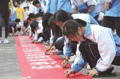 近日,遂昌县职业中等专业学校发起了“拒绝校园欺凌暴力,构建和谐平安校园”活动,旨在增强学生的法制观念和预防校园暴力的意识和能力。图为学生在横幅上签名,自愿加入“拒绝校园欺凌暴力“活动。 (本报通讯员 黄 微 摄)