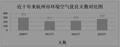 学生作业:2006年,杭州空气非常好,全年有301天空气质量达到优良。但是之后的6年时间,每况愈下,2012年只有217天。究其原因,主要有三点:北方大量雾霾的影响,城市工厂排放有毒气体,道路上汽车增多。雾霾让杭州穿上了一件灰蒙蒙的外衣,让这位“江南女子”不再秀美。随后,市政府加强管理与监督,空气质量明显改观。2015年空气质量优良天数比2014年多出41天。一年中,我们有超过一半以上时间能看见蓝天。希望我们这位“江南女子”撩去她那朦胧的面纱,露出美丽的面容。