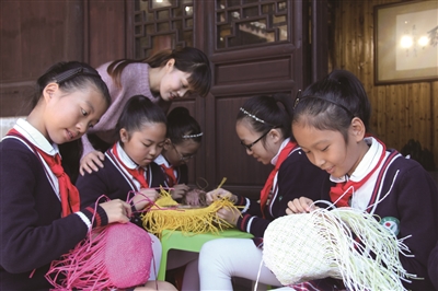 11月9日,由温岭市妇联和温岭市人力社保局主办的2017年温岭巧娘织帽比赛在高龙书院举行。图为比赛现场,来自温岭市箬横镇第三小学草编兴趣小组的学生们参加织帽体验活动。