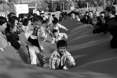 日前,长兴县夹浦镇中心幼儿园开展了亲子趣味运动会。你追我赶、二人三足、拉小车、投沙包、宝贝向前冲、揪尾巴、“空中爬行”等多样化的趣味项目让孩子和家长们乐翻了天。家长们既当啦啦队,又变身运动员,在运动场上与孩子并肩作战,增进了亲子关系,发扬了团结协作的体育精神。(本报通讯员 臧 健 许斌华 摄)
