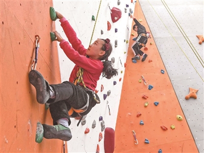 图为宁波市行知实验小学攀岩队队员正在进行日常练习。