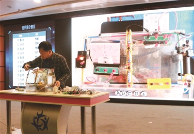 全省初中科学教师实验技能大赛决赛日前在杭州举行,11个设区市的33名初中科学教师参加了决赛。据悉,今年决赛新增了实验操作现场实时直播环节,不仅为教师交流学习搭建了一个远程展示的平台,也为那些不能到场的师生和科学爱好者提供了观摩比赛的机会。图为比赛现场。