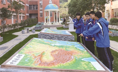 12月4日,青田县温溪高级中学“地理园”建成并正式开放。“地理园”里配置了世界地形图立体模型、中国地形图立体模型、日晷仪、地动仪、气象监测仪、地球内部构造模型、地质构造模型等设施,成为生动的地理第二课堂。图为学生们正在观看中国地形图立体模型。