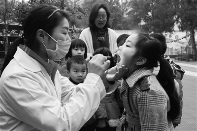 日前,在建德市人民政府机关幼儿园的门口,保健医生正在给入园的360多名孩子测量体温、观察口腔等晨间身体检查。