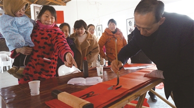 近日,建德市教育局、市教育工会组织教育书法协会会员赴派驻第一书记的航头镇航景村、“组团包干”结对村——钦堂乡谢田村以及各学校慰问困难群众、党员和教职工,并为当地群众、教职工写送春联1800多副,受到大家的欢迎。图为建德市教育书法协会会长翁化彦在航景村为群众写春联。(本报通讯员 舒新华 摄)