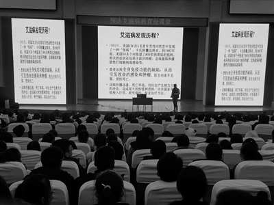 “预防艾滋病教育进课堂”巡讲活动是桐庐县的一项德育工作常规。近年来,该活动一直在各高中举行,取得了良好的教育效果。图为去年12月,近3000名高二学生聆听了该县疾病预防控制中心副主任李志芳所作的《青春与健康——2017年红丝带进校园》讲座。(本报通讯员 徐杭君 摄)