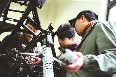 宁波工程学院杭州湾汽车学院为培养学生的创新能力,成立了以研究、设计、制造高性能节能车为目标的甬龙节能车队,并在多项赛事中获得好成绩。图为车队学生在制造新研发的节能车。