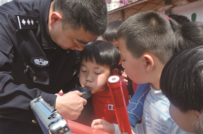 3月26日是第23个全国中小学生安全教育日,湖州市飞英小学举行了以交通安全为主题的系列活动。学校邀请了湖州市交警支队的交警,为学生展示了交警装备,教育他们要遵守交通规则,确保人身安全。图为学生在使用酒精测试仪。(本报通讯员 何庆华 摄)