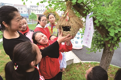 每年4月是我省野生动植物保护宣传月,4月10日至16日为全省爱鸟周,今年活动主题是“保护鸟类资源,守护绿水青山,像对待生命一样保护野生动植物”。4月12日,建德市寿昌第一小学护鸟小分队的小卫士在科学教师方丽仙的带领下,将一个个生态环保型鸟笼,分别悬挂在校园树上,给鸟儿安个新家。(本报通讯员 宁文武 摄)
