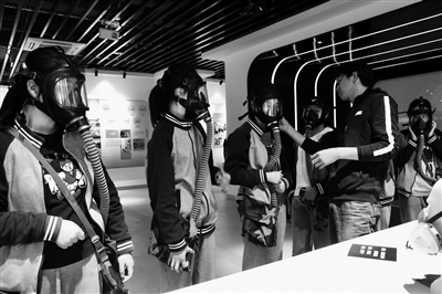 日前,舟山市防空防灾体验基地挂牌仪式暨舟山群岛新区人防(民防)体验馆在舟山市中小学素质教育实践学校举行。基地包括舟山群岛新区人防(民防)体验馆、指挥中心及疏散中心,总面积达500平方米。图为来自南海实验学校的学生在人防(民防)体验馆学习戴防毒面具。(本报通讯员 乐佳泉 钱江韵 摄)