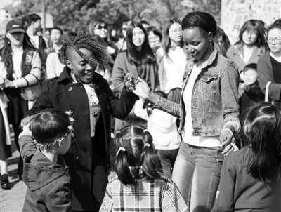 浙江海洋大学日前举行了第四届樱花节暨校园开放日,吸引了近两万名市民进校游览。除了往常的游园活动和校内场馆开放,今年校方还新增了留学生旗袍秀和才艺展示活动等。图为留学生在和前来参观的儿童们跳舞互动。(本报通讯员 沈家迪 摄)