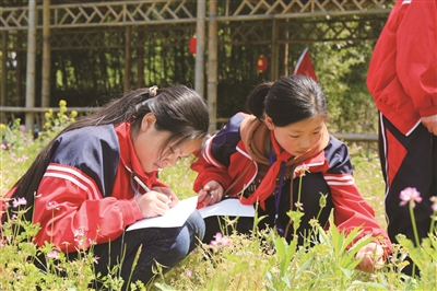 春日里,浦江县岩头镇中心小学学生在教师带领下走出课堂、走进田野,对常见植物开展探究性学习。学生在手机软件的辅助下,从认识植物的名字开始,通过观察、查找资料,对家乡常见植物有了初步了解。每名学生还认领一种植物,以写生绘画和文字描写的形式为其做卡牌。(本报通讯员 陈晓玲 摄)