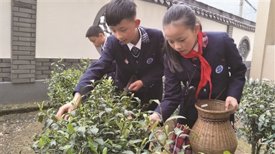 谷雨时节,杭州市富阳区里山镇中心小学学生和共同体学校富春第五小学的小伙伴们一起学习了安顶云雾茶的冲泡程序,了解二十四节气与茶叶种植的联系,并在茶园里采摘茶叶、交流采摘技巧。