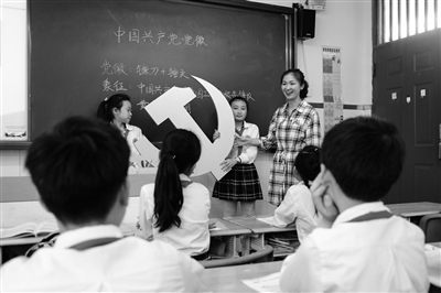 日前,杭州市拱墅区启动了“党的知识进课堂”行动,全区46所中小学增加了一门新的课程——“党的知识”。106个中小学党支部的2012名党员教师通过讲党的故事、学党的知识、唱党的歌曲、开展爱党活动等,把相关知识传授给学生。图为杭州市文澜小学的党员教师正在讲解党徽的含义。(本报通讯员 张筱燕 张琳飞 摄)