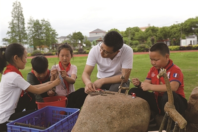 衢州市柯城区万田乡中心小学教师经常带领学生通过创意智造将废旧物品改造成可用可观赏的物品,以增强他们节约资源的责任感。图为教师蒋煜庭正带着学生利用枯树枝制作动物造型的木偶。