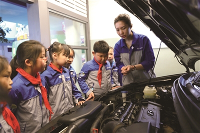 法官、汽车售后服务员、建筑工人……近日,嘉兴市南湖区余新镇中心小学组织学生走进杭州“Do都城”,开展职业体验活动。图为学生在聆听工作人员讲解汽车知识。