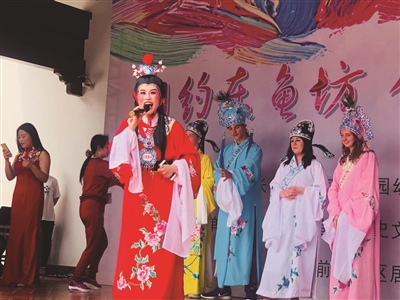 日前,长兴县东鱼坊历史文化街区,来自英国Ash Green中学的10多名学生和当地张家村花园幼儿园的师生们,一起登上古戏台表演经典越剧《追鱼》,感受中华传统民俗文化的魅力。图为活动现场。