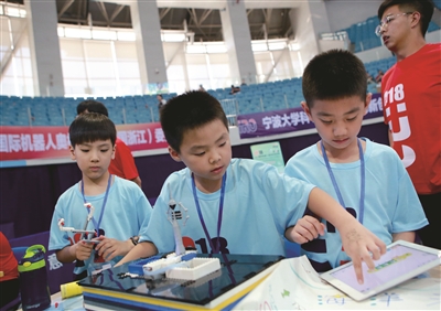 日前,第二十届IRO国际机器人奥林匹克大赛浙江赛区选拔赛在慈溪举行,来自上海、杭州、宁波等地的300名选手参加比赛。比赛分幼儿、小学、中学3个组别,设竞技赛、创意赛、挑战赛、机器人电影、程序设计等项目,优胜者将进入中国赛区总决赛。图为创意赛比赛场景。 (本报通讯员 林松根 摄)