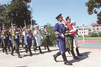 日前,江山市第五中学成立了首支学生国旗仪仗队。仪仗队由原南京某军区国旗班副班长担任教官,共有22名队员。该仪仗队定期训练,并参与学校升旗仪式。图为开学前,仪仗队正在紧张地训练中。