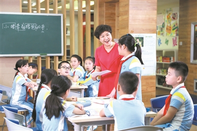 通过丰富的活动,重塑同伴、师生等人物关系,为儿童以积极而友善的心态交往“赋能”,这是崇文办学坚持多年的理念。“学生到学校里来,不仅要学习知识、技能,更要学会交往,通过活动、课程乃至班级文化的多年浸润,‘擅交往’已经成为我们学生最重要的特质。”俞国娣说。班级是学生天然的交往场所,有着家庭无法取代的作用。崇文一直以来提倡自主、合作、探究的学习方式,班级里桌椅摆放一改以往“秧田式”的方式,灵活多变的摆放形式更有利于合作学习的开展。