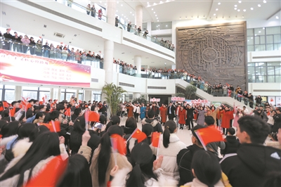 “我和我的祖国一刻也不能分割……”2月23日是浙江师范大学新学期开学的第一天,该校3个校区的600余名师生自制海报、自编歌舞,在图书馆、教学楼、食堂等处表达“我和我的祖国”的情感,礼赞新中国成立70周年,以迎接新学期开学。图为活动现场。(本报通讯员 池亨颖 摄)