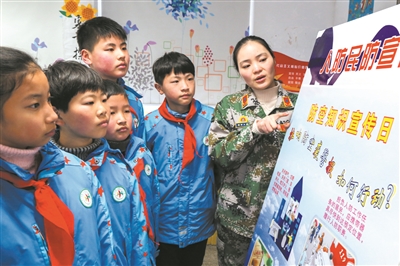 3月1日是“国际民防日”,长兴县教育局联合县人民防空办公室编印人防专刊、发放读本、巡展展板,向全县师生普及防灾减灾应急知识,提高防空防灾意识和自救互救能力。图为长兴县第四小学的学生在人防办教育展示区学习。(本报通讯员 许斌华 摄)