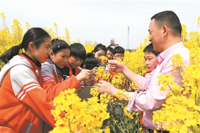 春天万物生长,是亲近自然、办好大地学堂的好时机。3月26日下午,嘉兴市南湖区余新镇中心小学六年级师生把科学课搬到了油菜花田里。图为教师在指导学生观察研究油菜花的生长特征。