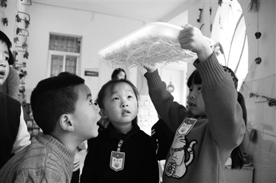 日前,缙云县实验幼儿园的幼儿用水培和土培的方式将豌豆、麦子、鸡毛菜等农作物成功育苗。他们在教师的指导下学习育苗知识,自己动手尝试,每天观察记录,比较不同农作物的出苗情况。图为幼儿在观察水培豌豆的根系。(本报通讯员 马春霞 杜益杰 摄)